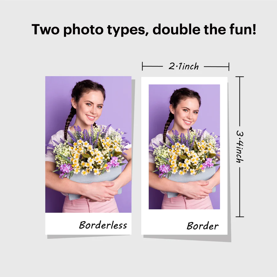 Divi fotoattēlu veidi: Ar Kodak Mini Shot 2 Retro fotoprinteri ir iespējams drukāt gan attēlus ar apmalēm, gan bez apmalēm. Ar šo tūlītējo kameru varat radīt paliekošas atmiņas, pierakstot savas atmiņas apmales veidā. Ja vēlaties tos iegūt lielākā izmērā, varat izdrukāt bezmalu fotoattēlus.