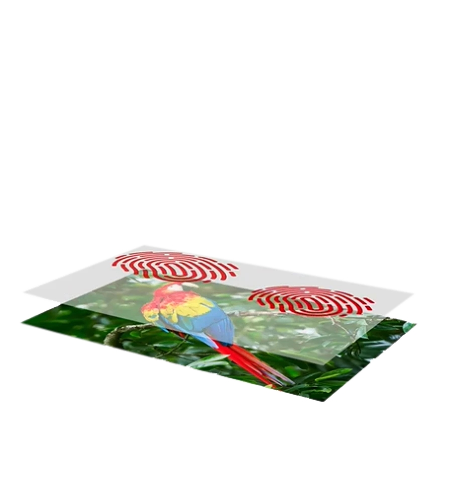 Tam ir arī caurspīdīgs pārklājums, kas aizsargā attēlus no piesārņojuma, piemēram, ūdens traipiem, putekļiem vai pirkstu nospiedumiem. Laminēšanas kārta palīdz ilgstoši saglabāt kristāldzidru krāsu kvalitāti.