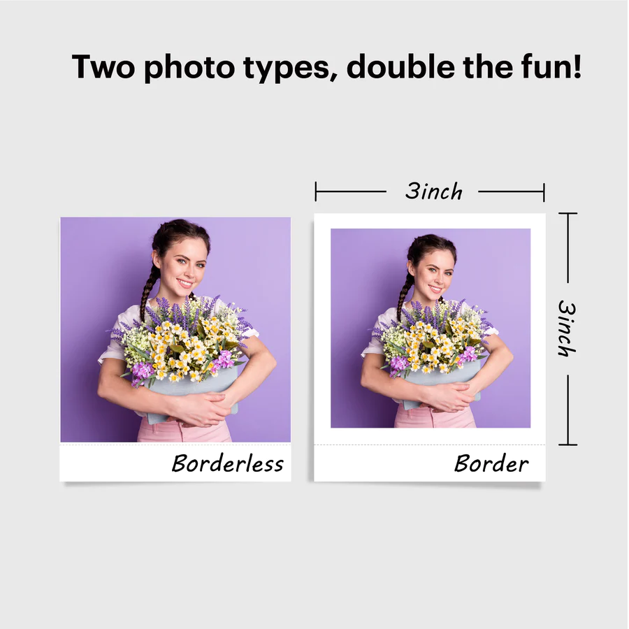 Divi fotoattēlu veidi: Ar Kodak Mini Shot 3 Retro fotoprinteri ir iespējams drukāt gan attēlus ar apmalēm, gan bez apmalēm. Ar šo tūlītējo kameru varat radīt paliekošas atmiņas, pierakstot savas atmiņas apmales veidā. Ja vēlaties tos iegūt lielākā izmērā, varat izdrukāt bezmalu fotoattēlus.
