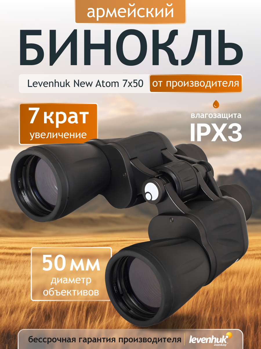 Levenhuk New Atom 7x50 klasiskie lauka binokļi ir ideāli piemēroti medniekiem, jūrniekiem, aktīviem tūristiem, karavīriem un citiem. Ar 7x palielinājumu, lielām 50 mm pilnīgi apstrādātām objektīva lēcām un Porro prizmām, šis instruments nodrošina skaidras, spilgtas un augstas kontrasta attēlus dažādos gaismas apstākļos. Pateicoties IPX3 lietus aizsardzībai, šos binokļus var droši lietot gandrīz jebkurā laika apstākļos. Ērtai un ilgam skatīšanai laukā tos var uzstādīt uz statīva, izmantojot adapteri (piedāvā atsevišķi).
