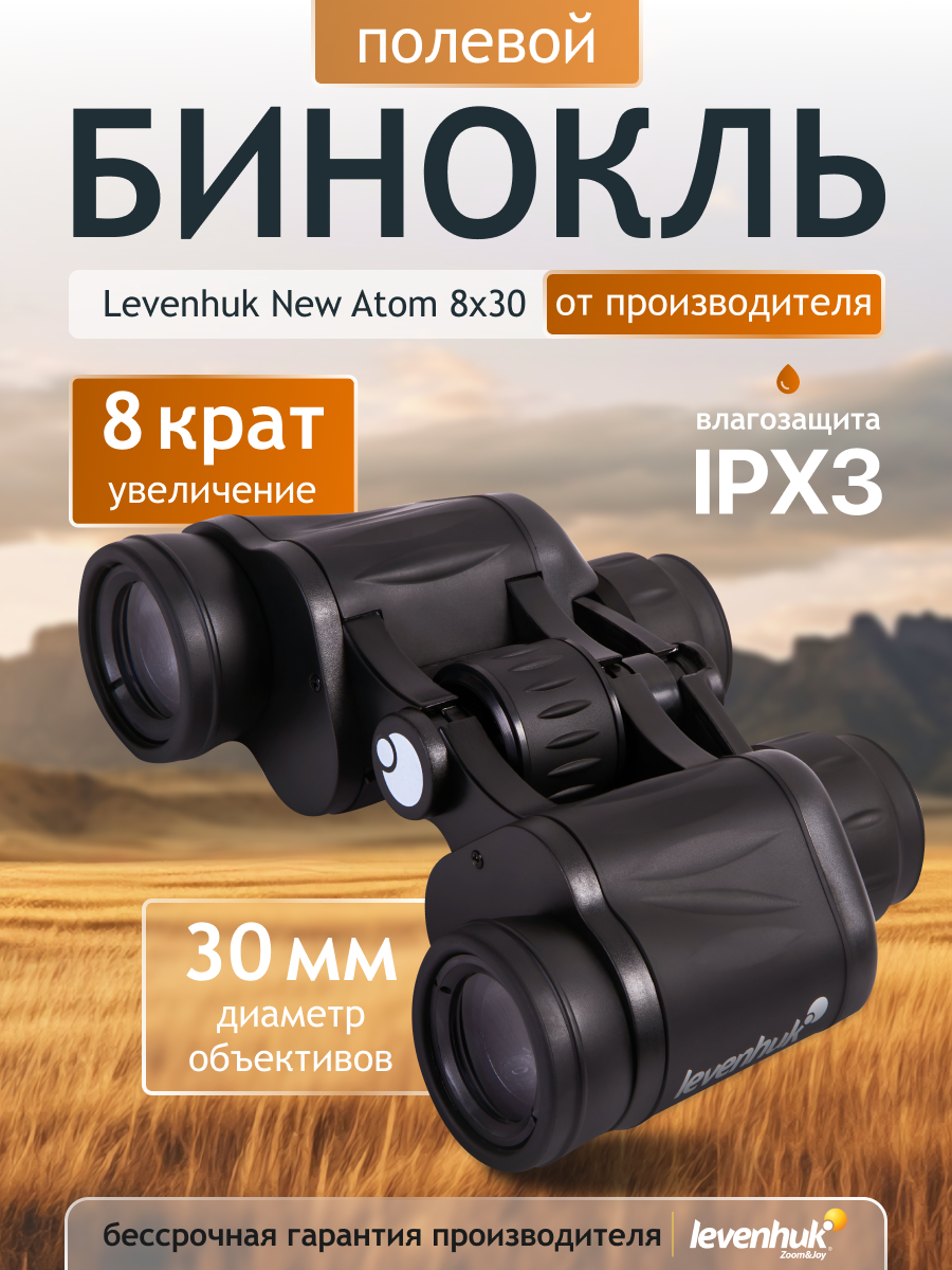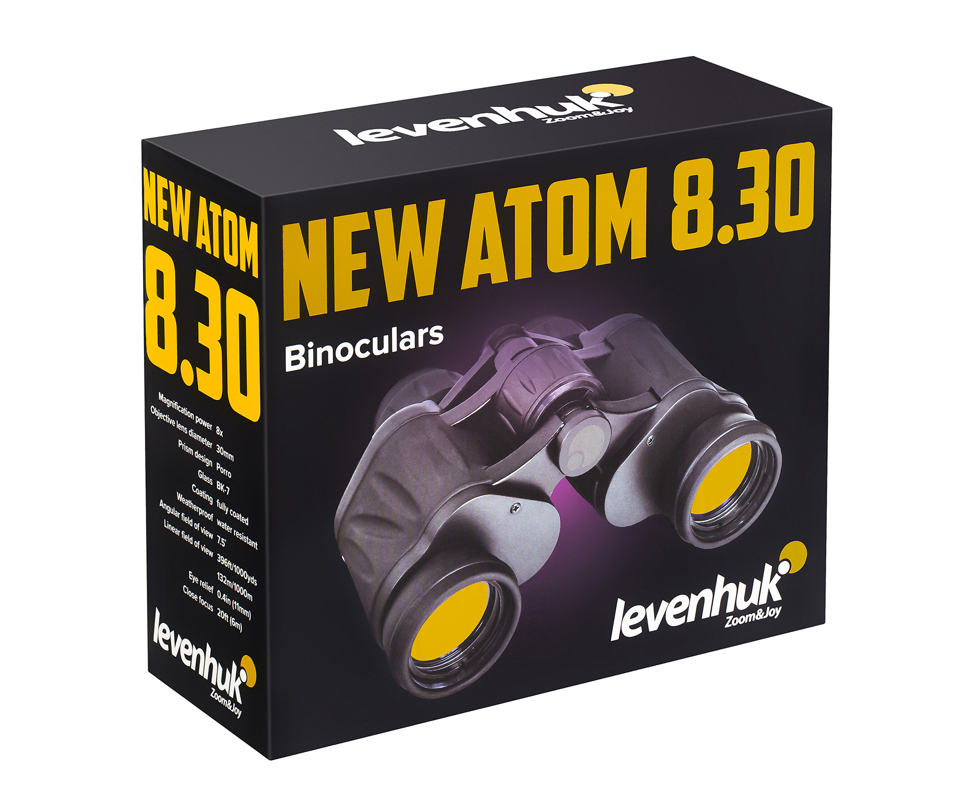 Levenhuk New Atom 8x30 binokļi nodrošina praktisku līdzsvaru starp palielinājumu, redzes lauku un tuva fokusa spēju. 30 mm objektīva lēcas un 8x palielinājums ļauj binokļiem koncentrēties uz objektu, kas atrodas tikai 6 metru attālumā no vērotāja. Leņķīgais redzes lauks ir 7.5°, tādējādi tā atbilstošais redzes lauks ir 132 metri uz attālumu 1 km, padarot binokļus par daudzpusīgu un uzticamu biedru putnu vērotājiem, zvejniekiem, medniekiem vai tūristiem.