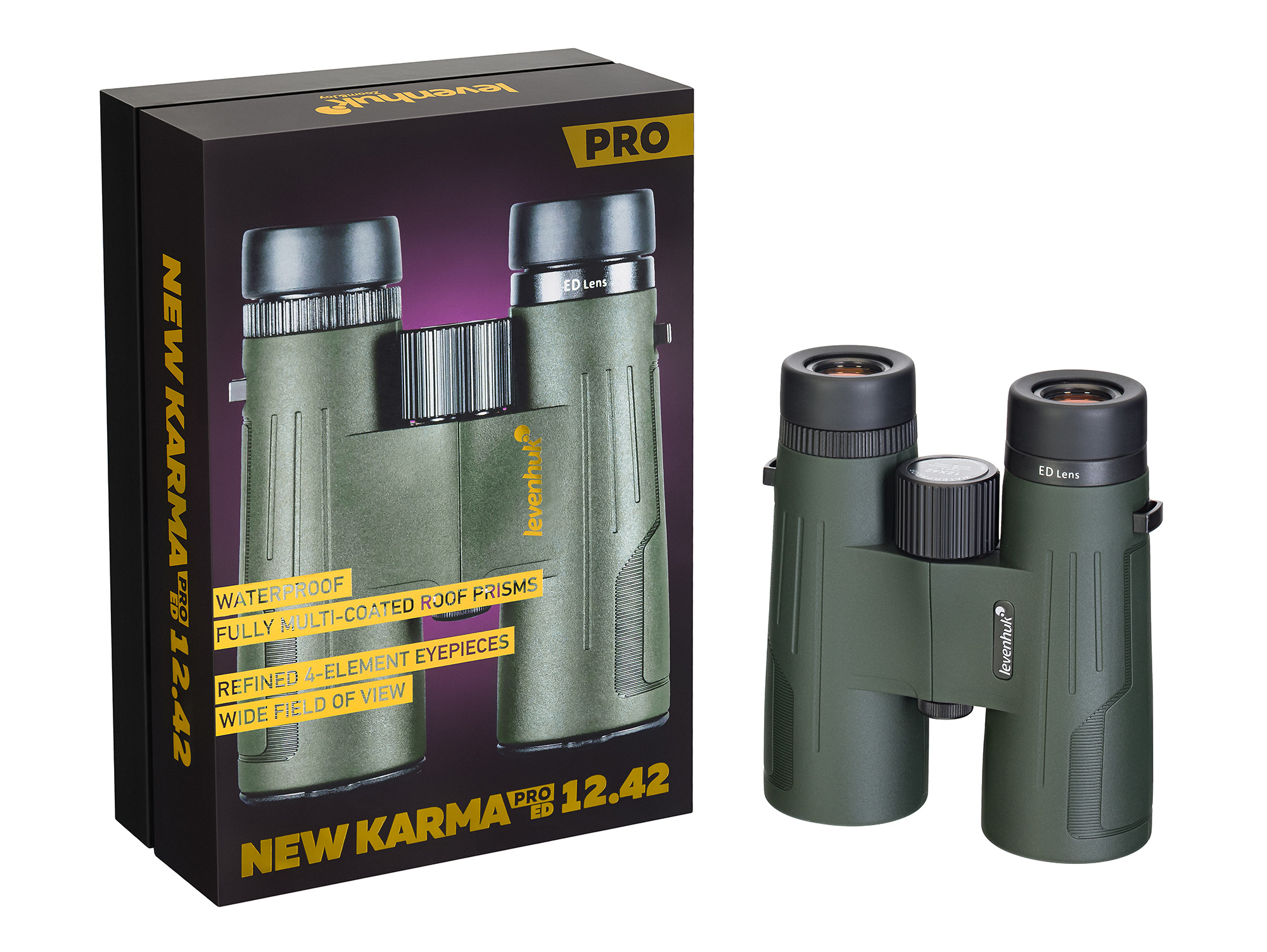 Levenhuk New Karma PRO ED 12x42 binokļi piedāvā jaudīgu optiku, inteliģentu konstrukciju un daudzpusību visos apstākļos. Tos var izmantot jebkuros laika apstākļos, nezaudējot veiktspēju. Šie binokļi atbilst profesionāļu un entuziastu prasībām, kuriem nepieciešama detalizēta apkārtējās vides novērošana kritiskiem uzdevumiem vai āra aktivitātēm, tostarp medniekiem, makšķerniekiem, dabas pētniekiem, drošības darbiniekiem, ārkārtas reaģētājiem un citiem speciālistiem darbā ārā.