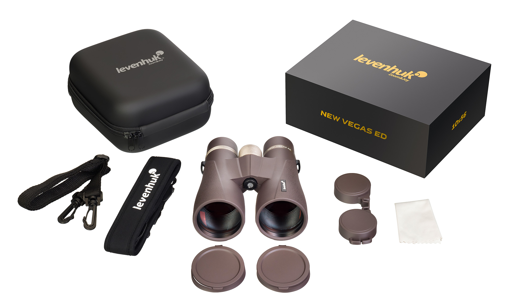 Optiskā sistēma balstās kompaktos divslīpju prismās un visi optiskie komponenti izgatavoti no BaK-4 stikla ar augstu gaismas pārraidi. Lēču materiāls ir ED stikls, kas samazina hromatisko aberrāciju. Visi optiskie elementi ir multiklāji, lai palielinātu attēla spilgtumu. Oktiņās ir īpaši izstrādāti, iekļaujot piecas daļas trijās grupās, kas palīdz radīt vēl reālāku un asāku attēlu. Kā rezultātā Levenhuk New Vegas ED 10x56 binoklis nodrošina vienmērīgi gaišus, krāsām atbilstošus skatus visos apstākļos. Lietotājiem, kuriem nepieciešama redzes korekcija, binoklī ir dioptriju korekcija ±4D diapazonā.