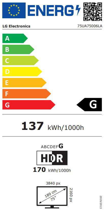 | Enerģijas patēriņš standarta dinamiskā diapazona režīmā (SDR), 1000 h | 137 kWh | |