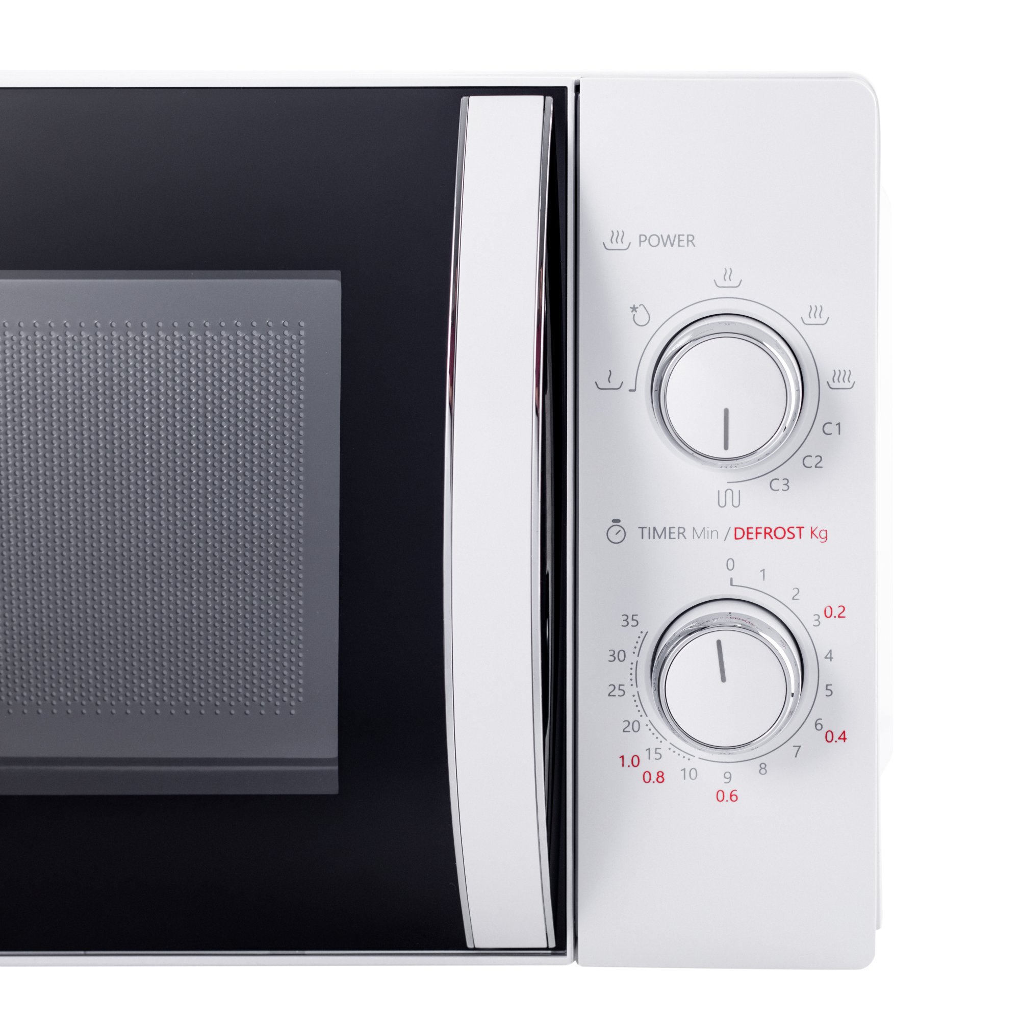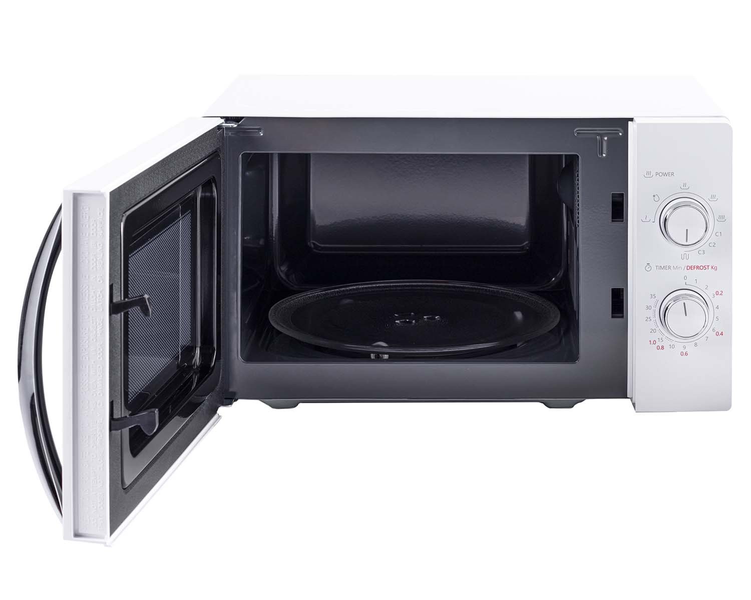 Mikroviļņu krāsns Toshiba MW MG20PWH, 20 L, ar mehānisko vadību, 800 W jaudu, 6 jaudas līmeņiem un LED apgaismojumu, baltā krāsā. Tā ir izstrādāta, lai saīsinātu gatavošanas laiku, nezaudējot veiktspēju: 450 g gaļas tā atkausē 6 minūtēs un 30 sekundēs, bet 450 g ēdiena uzsilda 4 minūtēs un 30 sekundēs. Krāsns piedāvā elegantu dizainu, atkausēšanas programmu, klasisku izliektu rokturi, intuitīvu vadības paneli, izturīgas eņģes, neslīdošas kājiņas un ūdensizturīgu, viegli tīrāmu iekšējo sienu. Izmēri: 44 × 33,4 × 25,9 cm.