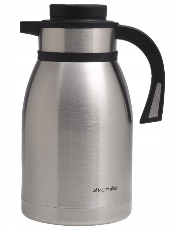 Nerūsējošā tērauda termoss 2,0 L, sudraba, 2222, KAMILLE. Izgatavots no nerūsējošā tērauda un plastmasas. Aprīkots ar pogu precīzai dzērienu ieliešanai. Tilpums: 2,0 L. Maks. karstuma/aukstuma saglabāšana: līdz 8 stundām.