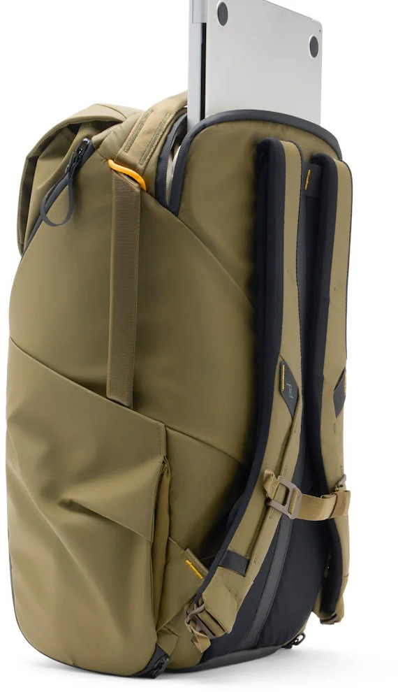 Inside, 3 configurable FlexFold dividers keep gear organized, protected, and not bunched at the bottom of your bag. Dedicated sleeves for up to 15” laptop (or 16" MacBook Pro), tablet, or documents, plus a variety of internal slip pockets for small items. 100% recycled 400D weatherproof shell keeps everything safe.