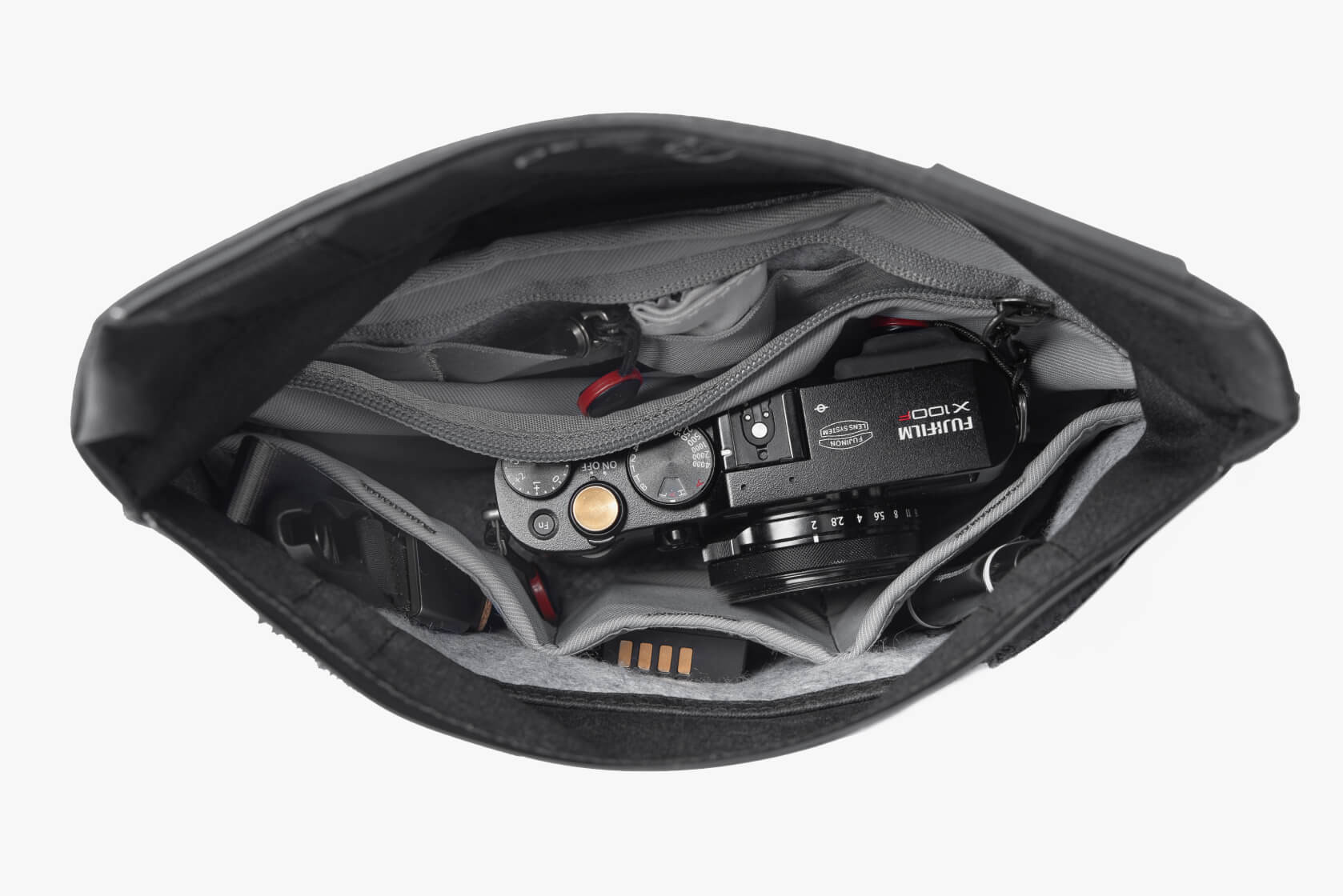 Field Pouch is Peak Design’s only organizer that is truly 2 bags in 1: a minimalist carry-all sling bag, and compressible in-bag organizer. A roll-top opening grants easy access, massive expansion (it doubles in volume), and quick compression to eliminate unused space. Inside you’ll find a thoughtful layout of stretch pockets and zip pockets to keep cords, cards, batteries, keys — even small lenses or camera bodies — organized and not jingling around. Included ultralight adjustable strap enables cross-body or shoulder carry, and integrated belt loops allow for waist carry. For a lightweight shooting setup, attach a Capture Clip (sold separately) and keep your camera outside the pouch—keep your rig at-the-ready, and increase storage space for accessories. All fabrics are recycled and Bluesign approved, including the soft internal felt liner and the 400D double poly-coated weatherproof nylon canvas shell.