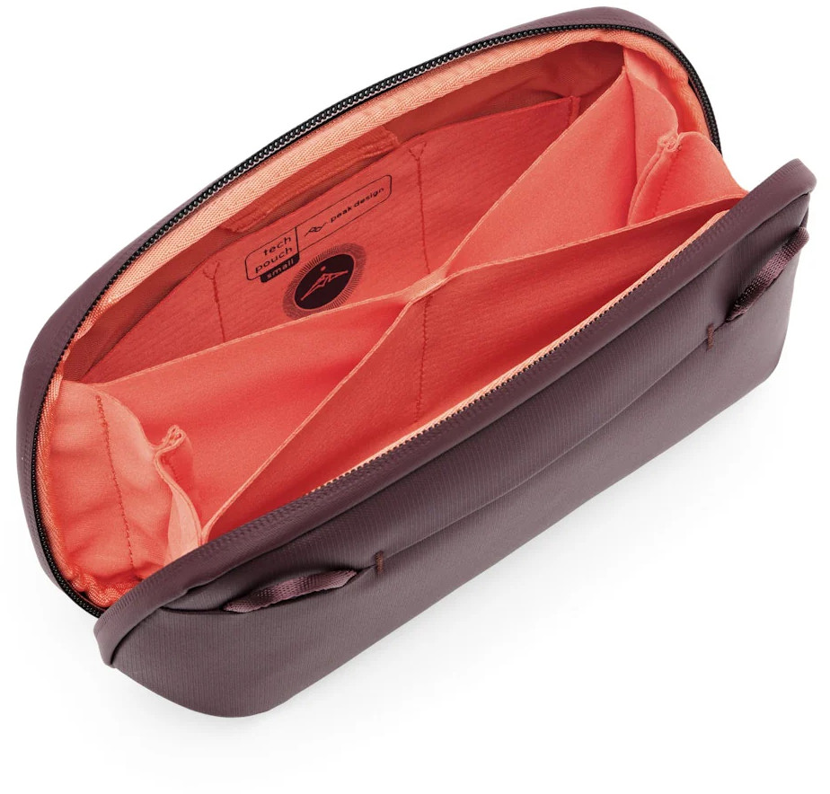 The Small Tech Pouch takes the award-winning design, utility, and aesthetics of our bestselling original Tech Pouch, and scales it all down to half-size. Small enough to stuff in any corner of any bag, yet impressively full-featured, the Small Tech Pouch is ideal for everyday essentials like cords, cards, batteries, and chargers (fits all Apple brick-style chargers). Interior features a 12-pocket design, including 4 large origami-style pockets for larger items, a variety of smaller stretch and zip pockets for small things, and a single pen/stylus loop. Exterior is durable and weatherproof thanks to proprietery Versa Shell™ 400D external fabric and burly #8 UltraZip™. Bag opens extra-wide and sits perfectly upright for total visibility and access. External grab handle and corner pleats make it easy to pull the pouch out of tight spaces. 2 Cord Hook™ loops allow you to connect any PD camera strap or carry strap (sold seperately) to convert the pouch into a sling bag. Fair Trade Certified and 100% carbon neutral.