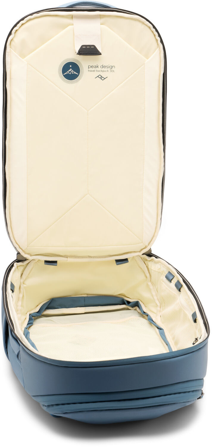Works seamlessly with Peak Design Packing Cubes and Pouches, sold separately. Fits Peak Design Camera Cubes, but only in its expanded form. For optimal photo gear carry, we recommend the larger 45L Travel Backpack.