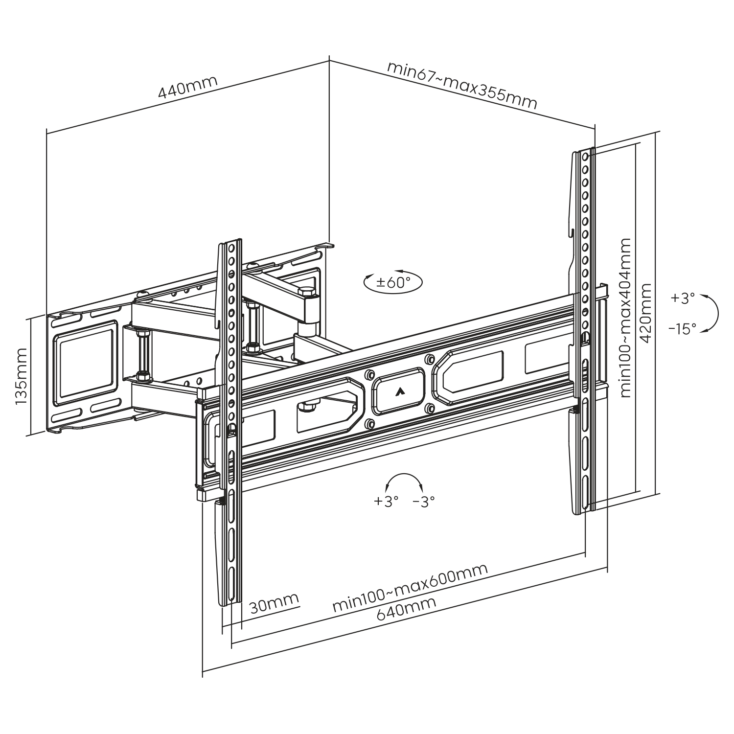 Vertikālais slīpums: +3°/ -15°