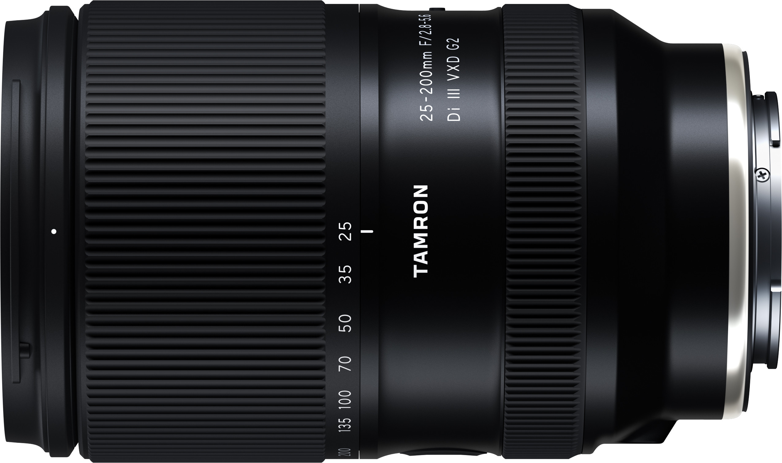 The new G2 model maintains its compact size while expanding the wide end from 28mm to 25mm and preserving the 200mm telephoto range. It offers improved image quality and faster, more precise autofocus powered by TAMRON's VXD1 linear motor focus mechanism. With a maximum magnification ratio of 1:1.9 at the 25mm wide end, the lens also provides half-macro shooting.