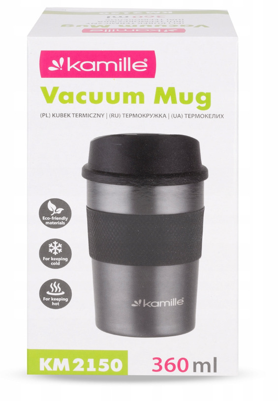 Termokrūze 360 ml (tumši pelēka), 2150, KAMILLE. Izgatavota no nerūsējošā tērauda ar silikona ārējo uzmavu. Aprīkota ar automātisku aizbāzni. Tilpums: 360 ml. Maksimālā siltuma/aukstuma saglabāšana: līdz 8 stundām.