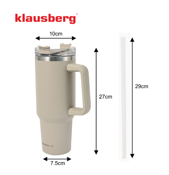 Termokrūze ar salmiņu, bēša, 1100 ml, nerūsējošais tērauds, Klausberg, KB 7944. Liela 1100 ml ietilpība – ideāli piemērota garām maiņām, ceļojumiem un visas dienas izbraucieniem. Izolēts nerūsējošā tērauda korpuss – uztur dzērienus siltus stundām ilgi. Ērts sānu rokturis – stabils un drošs satvēriens pat tad, kad krūze ir pilna. Vāks ar atlokāmu snīpi ērtai dzeršanai un mazākam izliešanas riskam. Salmiņš iekļauts – ideāli piemērots ledus kafijai, smūtijiem vai limonādei. Moderns dizains krēmkrāsas bēšā krāsā ar tērauda malu. Konusveida apakšdaļa (~7,5 cm) – der lielākajai daļai automašīnu un biroja stiprinājumu. Plata atvere (~10 cm) – atvieglo ledus vai augļu šķēļu pievienošanu. Augstums aptuveni 27 cm – lielas ietilpības un ērtas lietošanas apvienojums.