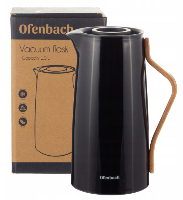 Termoss ar 1,0 L stikla kolbu, Ofenbach, 101329. Termosa korpuss ir izgatavots no plastmasas, ar stikla kolbu iekšpusē. Tilpums: 1000 ml. Maksimālā karstuma/aukstuma uzturēšana: 12–16 stundas. Pieejams melnā krāsā.