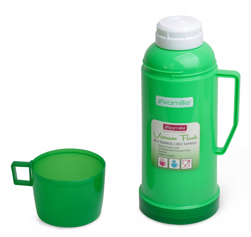 Termoss ar stikla ieliktni 0,45 L, 2070, KAMILLE. Termosa korpuss ir izgatavots no plastmasas, ar stikla ieliktni iekšpusē. Komplektā ietilpst 1 krūzīte. Tilpums: 450 ml. Augstums: 23,5 cm. Pamatnes diametrs: 8,5 cm. Maksimālā siltuma/aukstuma saglabāšana: 12–16 stundas. Pieejams 3 krāsās: zaļa, pelēka, zila.