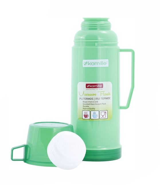 Termoss ar stikla ieliktni 0,6 L, 2071, KAMILLE. Termosa korpuss ir izgatavots no plastmasas, ar stikla ieliktni iekšpusē. Komplektā ietilpst 1 krūzīte. Tilpums: 600 ml. Augstums: 24,5 cm. Pamatnes diametrs: 10 cm. Maksimālā siltuma/aukstuma saglabāšana: 12–16 stundas. Pieejams 3 krāsās: zaļa, pelēka, zila.
