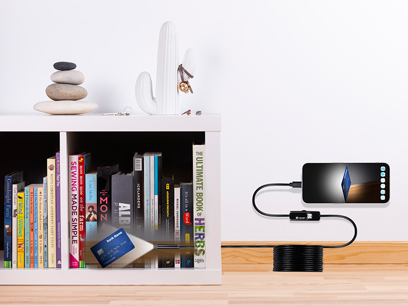 5 metrus garš, nostiprināts video kabelis ļaus ievadīt pārbaudes kameru jebkurā virzienā bez “objektīva bīdīšanas” efekta. Atšķirībā no elastīgajām auklām, jūs varat pielāgot šī kabeļa formu, lai ievietotu to šaurās vietās un parādītu šīs precīzās vietas attēlu monitorā vai viedtālruņa ekrānā.