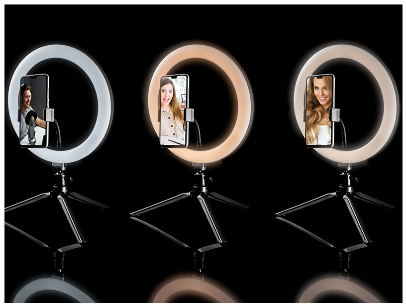 • Komplektā ir 26 cm gredzenveida lampa, statīvs un tālvadības pults gaismas intensitātes un krāsas regulēšanai