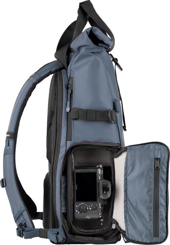 - Side camera access door plus full clamshell rear opening to the main compartment.